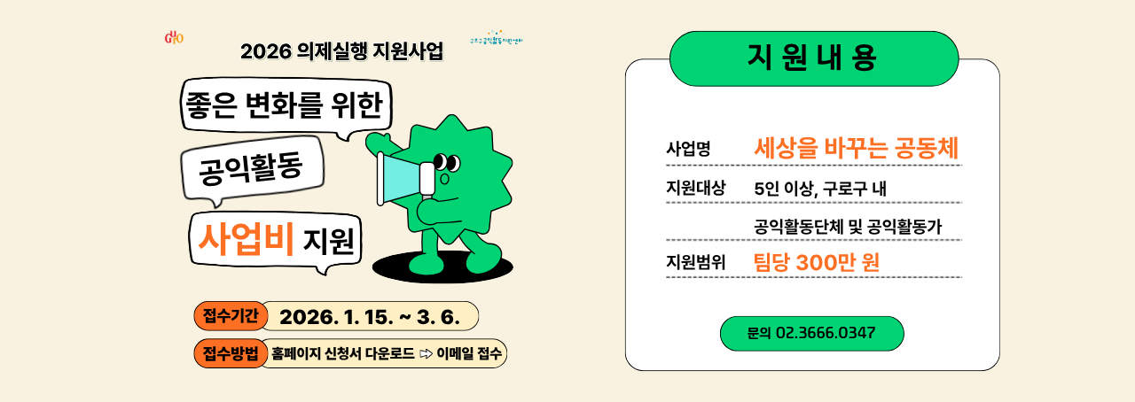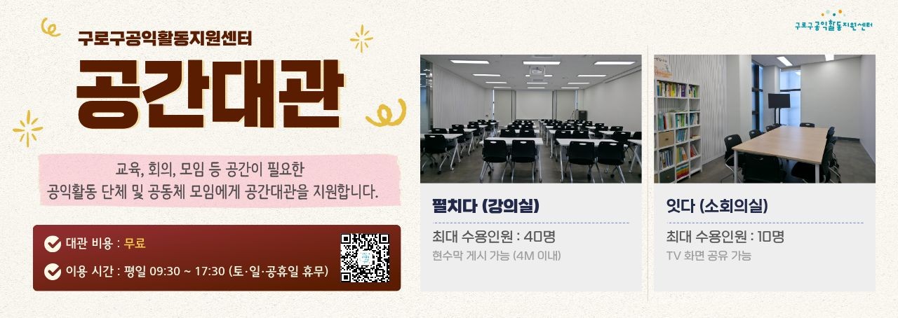 구로구 내 공익활동단체와 공익 활동가, 공익활동과 관련있는 모임에게 회의실 대관을 지원합니다.