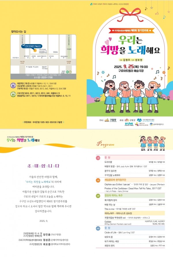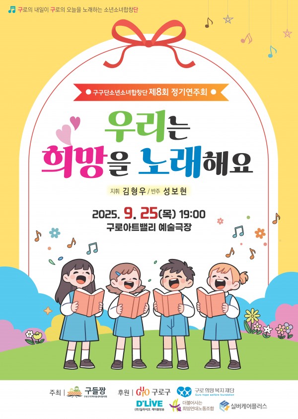 구로의 관심과 사랑으로 2015년 창단하여 올해 8회 정기연주회를 맞이하게 되었습니다. 여전히 여러분의 관심과 사랑이 필요한 우리 구로의 아이들이 펼치는 희망을 노래하는 정기연주회에 관심과 참여 부탁드립니다.