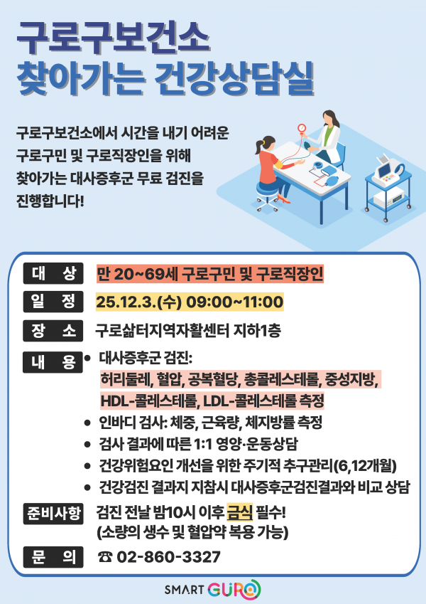 12월 3일 우리 센터에서 구로보건소 출장 대사증후근검사 있습니다.