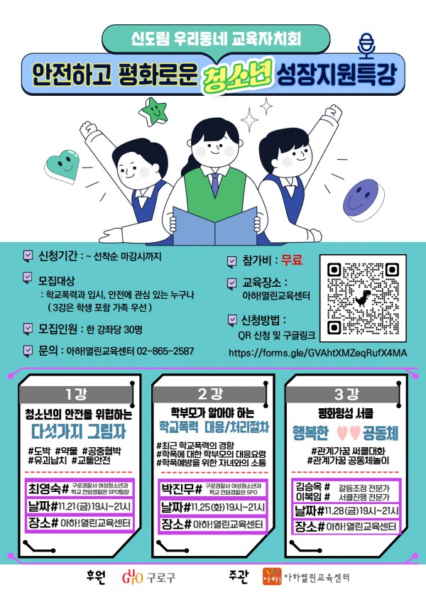 신도림우리동네교육자치회 교육 강좌 안내 작성자 최고관리자 작성일 2025.11.19 조회수 8 안녕하세요~신도림우리동네교육자치회에서 준비한 강좌입니다. 학교폭력과 청소년들의 안전에 관심있으신분들의 많은 참여 부탁드립니다. 출처: 구로마을넷/2025.11.18/이복임님 목록
