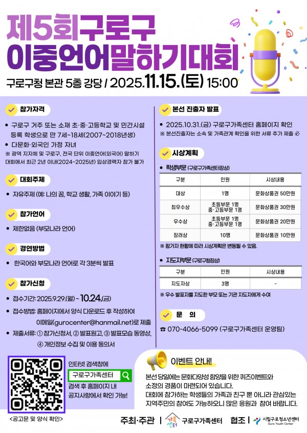 이번 대회는 다문화·외국인 학생들의 이중언어 재능을 발휘하고, 긍정적인 자아존중감을 키우는 소중한 기회가 될 것입니다. 주변 학생들이 참여할 수 있도록 함께 독려해주시면 감사하겠습니다.