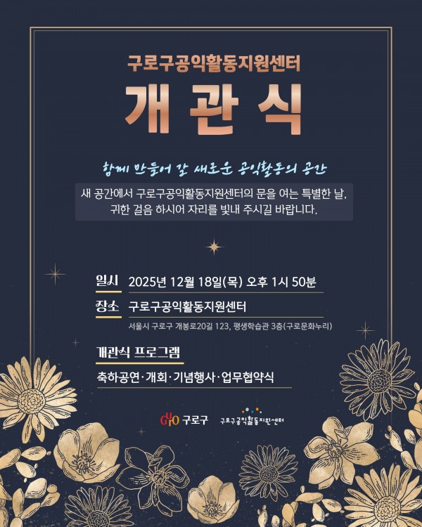 새로운 터전에서 구로구공익활동지원센터의 문을 여는 특별한 날, 귀한 걸음 하시어 앞으로 이곳에서 펼쳐질 공익활동의 미래를 함께 응원해 주시기 바랍니다.